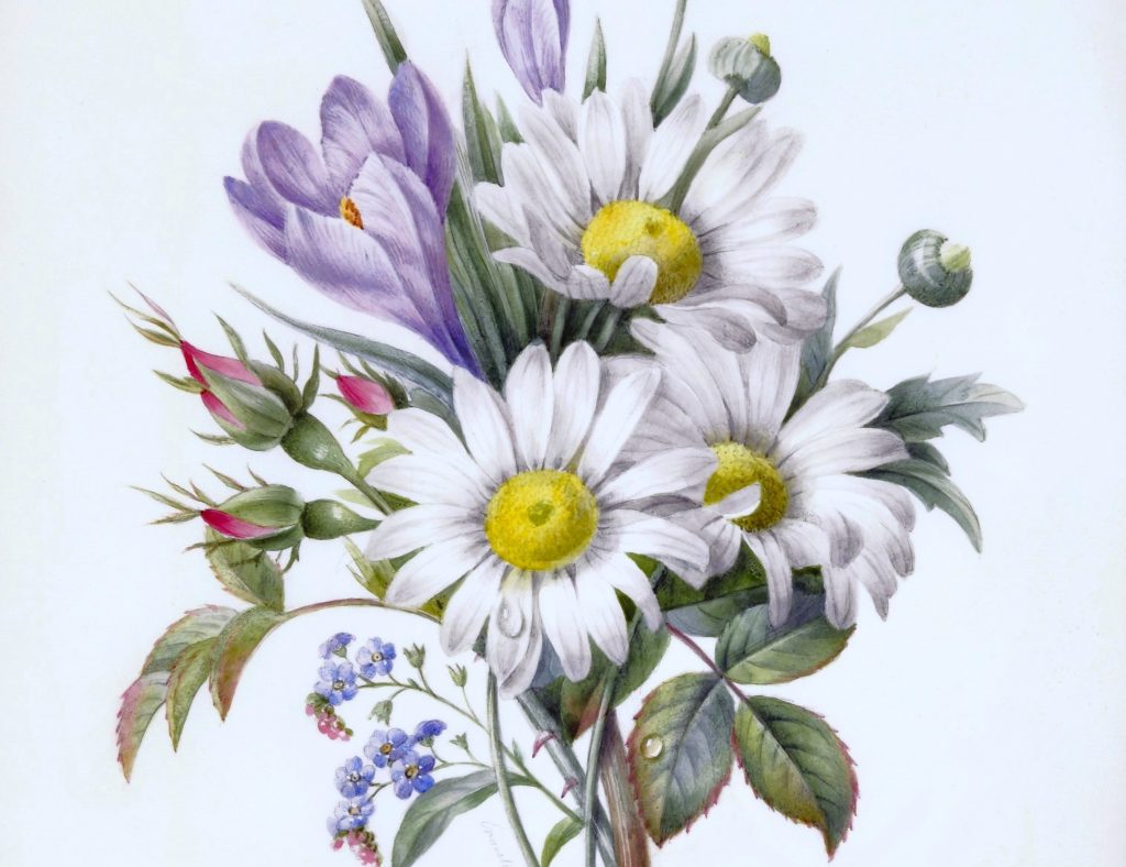 Marguerites, myosotis, crocus, roses (fleurs et bourgeons)