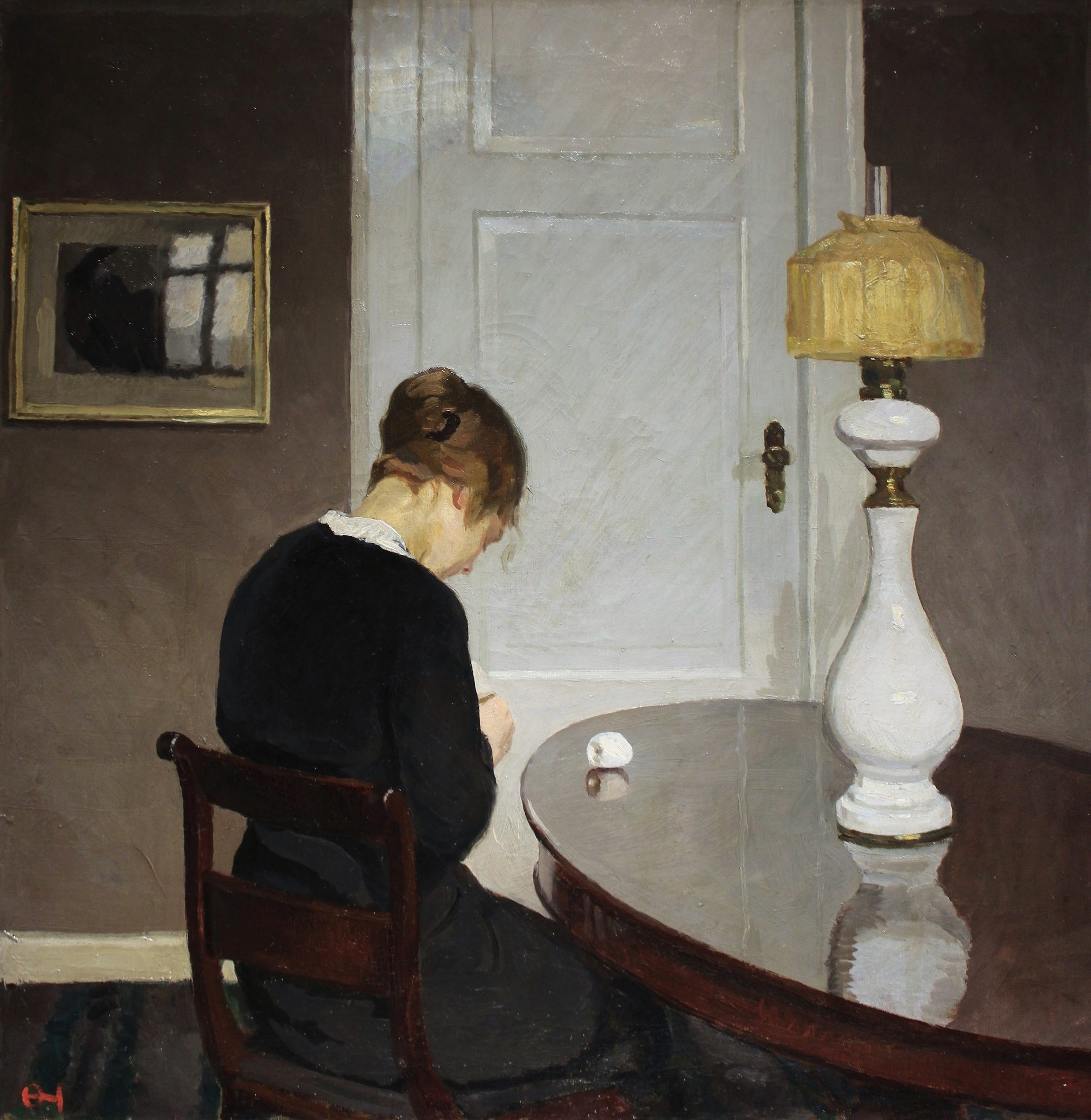 Notre tableau correspond aux vues d’intérieur intimistes, avec des effets de clair-obscur marqués, qu’il produit au début de sa carrière, et qui rappellent évidemment les compositions de Hammershoi, Peter Ilsted ou Carl Holsoe, dans lesquelles un unique personnage, éclairé par une douce lumière nordique, tourne souvent le dos au spectateur.