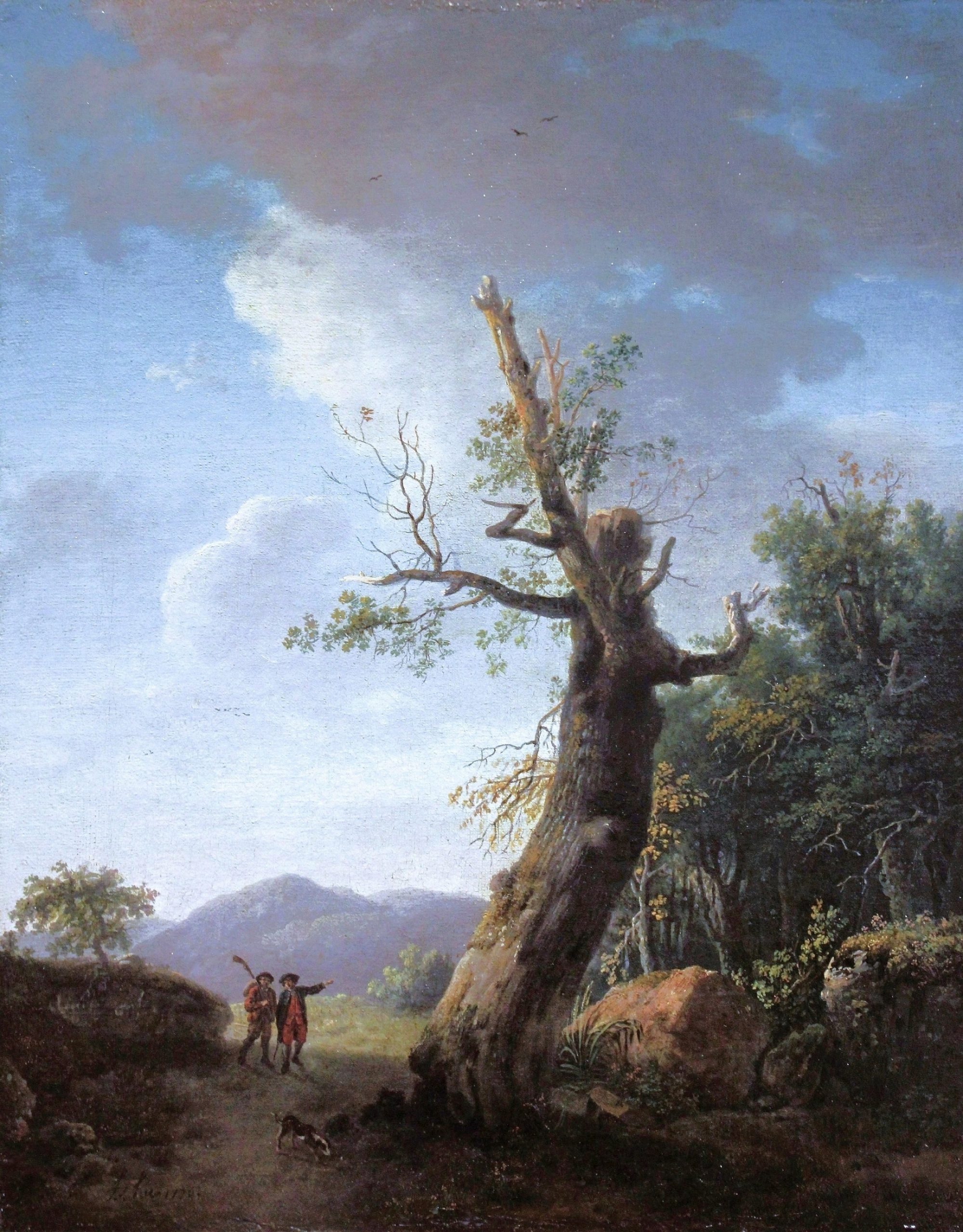 Paysage à l’arbre animé de chasseurs