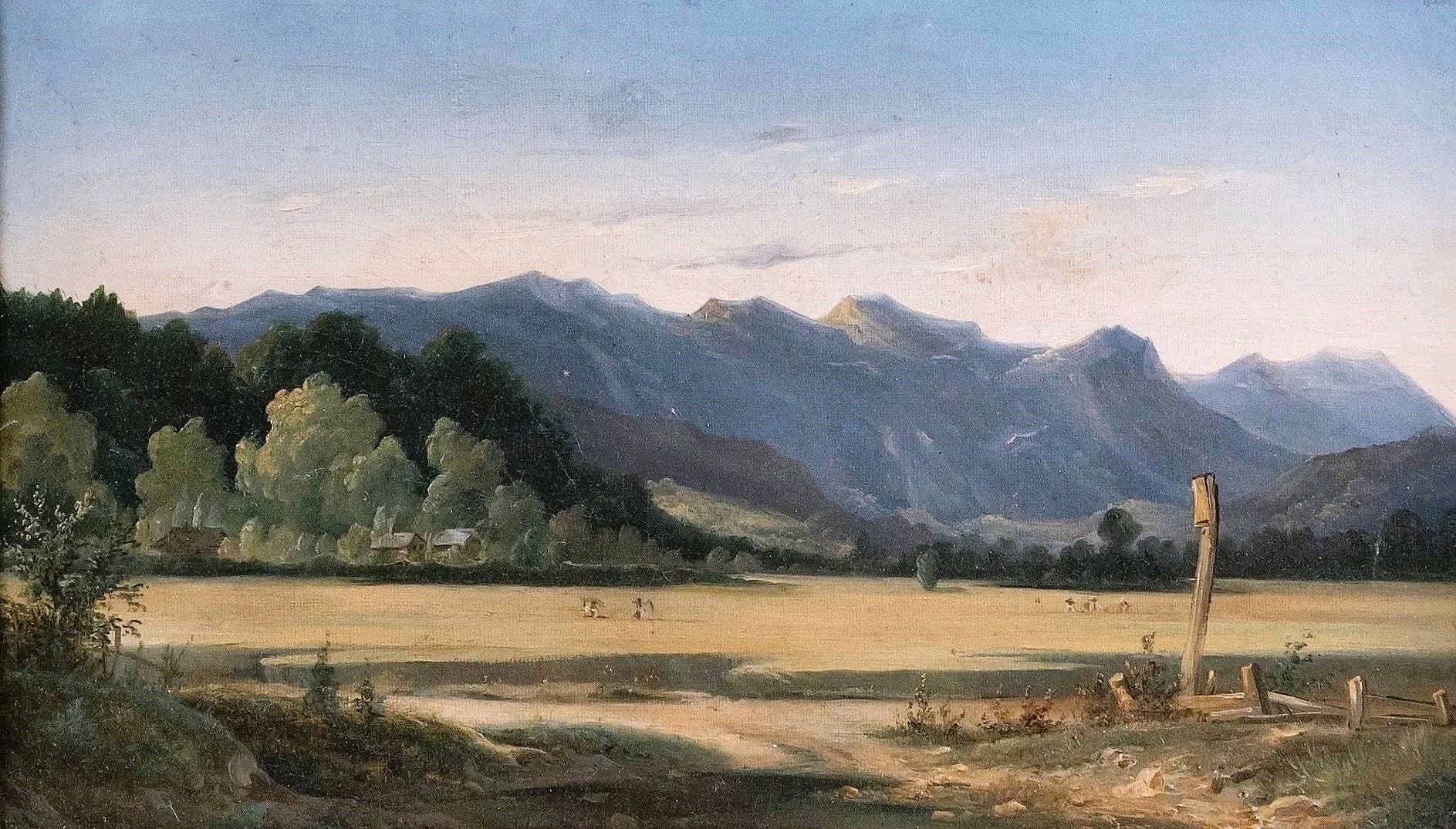 L’artiste, qui n’avait pas besoin de peindre pour vivre, était établi dans la Drôme, près de Crest, et il est possible que notre peinture représente une scène de moissons dans une plaine au pied des Préalpes.
